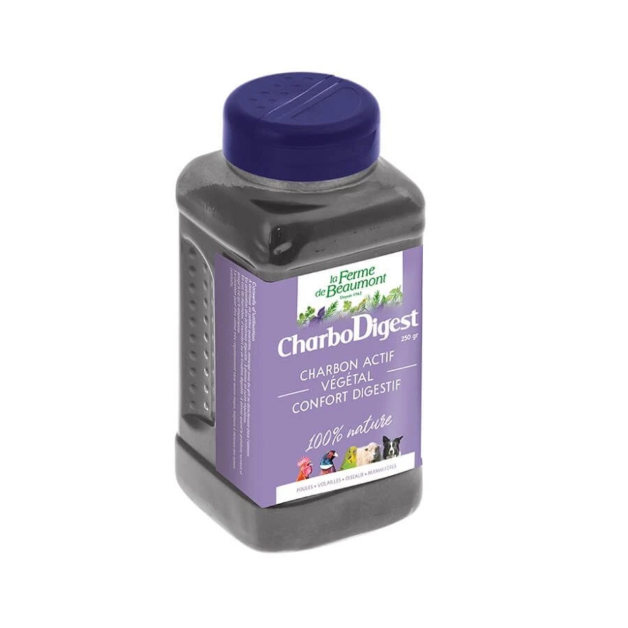 CharboDigest de la Ferme de Beaumont est composé à 100% de charbon actif végétal. Il va améliorer le confort digestif de votre animal.