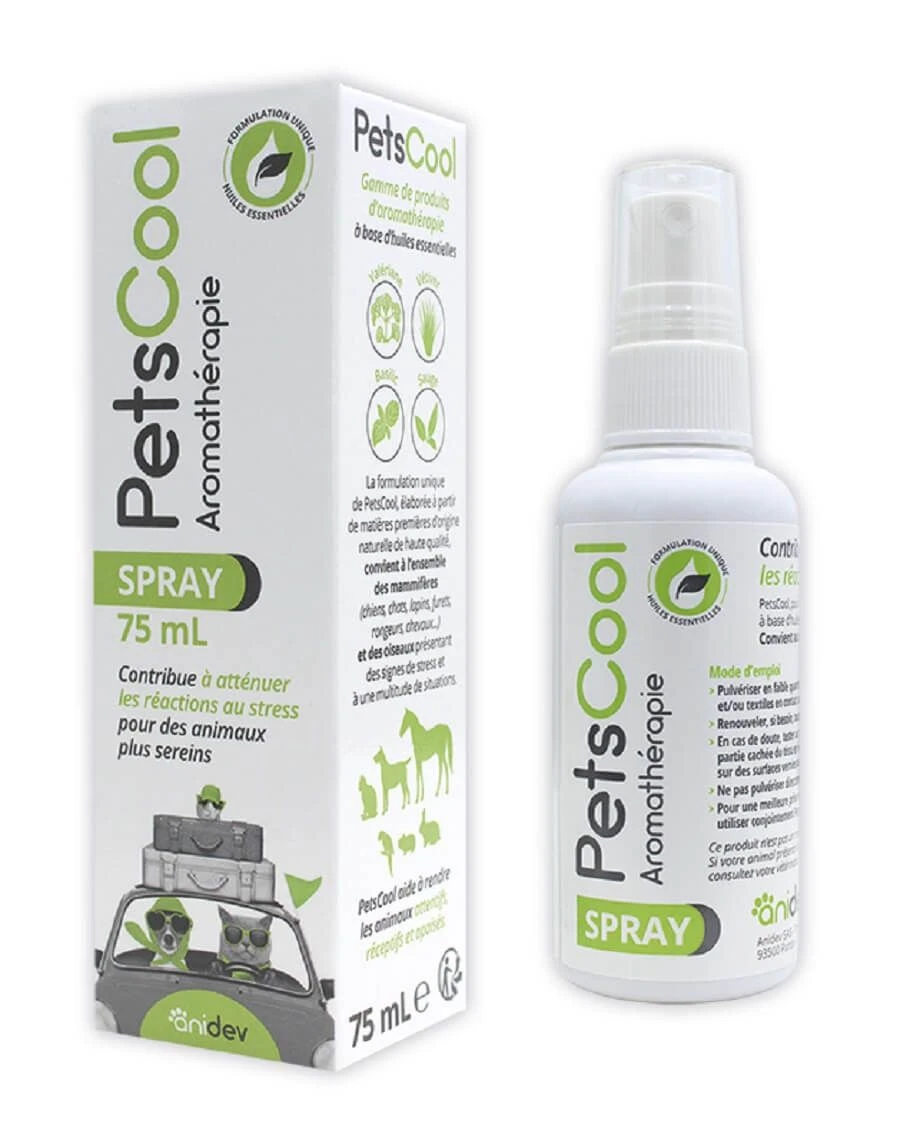 PetsCool est un mélange d’huiles essentielles de valériane, de vétiver, de sauge et de basilic qui va permettre d’atténuer les situations de stress chez les mamifères. C’est un produit d’aromathérapie par inhalation pour animaux. Grâce à son mode d’action non spécifique, PetsCool® n’est pas spécifique à une espèce : PetsCool® convient à l’ensemble des mammifères (chiens, chats, rongeurs, lapins, chevaux…) et aux oiseaux. PetsCool permet à tous les animaux de vivre plus sereinement ensemble.