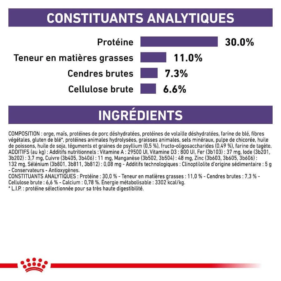 Cette alimentation contient des fibres solubles et insolubles, y compris du psyllium et des prébiotiques ce qui va aider à favoriser la sensation de satiété mais également favoriser une digestion saine.